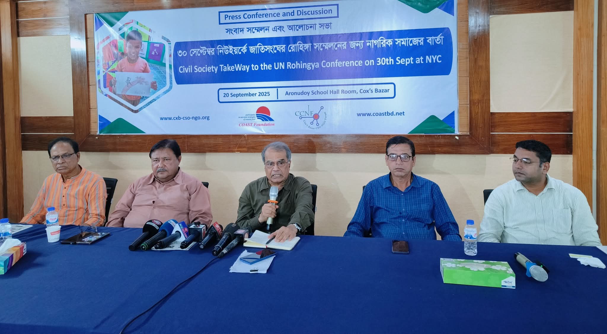 আসন্ন ৩০ সেপ্টেম্বর জাতিসংঘে রোহিঙ্গা বিষয়ক সম্মেলনের আগে কক্সবাজার শহরের অরুণোদয় স্কুলের অডিটরিয়ামে কোস্ট ফাউন্ডেশনের উদ্যোগে আয়োজিত মতবিনিময় সভা ও সংবাদ সম্মেলনে বক্তারা সুপেয় পানি সংকট নিরসন, আবাদী জমি পুনরুদ্ধার ও কার্যকর বর্জ্য ব্যবস্থাপনায় জাতিসংঘসহ আন্তর্জাতিক সম্প্রদায়ের বিনিয়োগের আহ্বান জানান। সংবাদ সম্মলেনে সভাপতিত্ব করেন কোস্ট ফাউন্ডেশনের নির্বাহী পরিচালক জনাব এম. রেজাউল করিম চৌধুরী। পুরো অনুষ্টানটি সঞ্চালনা করেন কোস্ট ফাউন্ডেশনের সহকারী পরিচালক জাহাঙ্গীর আলম। উপস্থিত ছিলেন কক্সবাজার প্রেসক্লাবের সভাপতি মাহবুবুর রহমান, উখিয়া কলেজের সাবেক অধ্যক্ষ অজিত দাস, সাবেক এপিপি সাকী এ-কাউসার, বিশিষ্ট লেখক রুহুল কাদের বাবুল, সেইভ দ্য কক্সবাজারের সভাপতি তৌহিদ বেলাল, অধিকার কক্সবাজারের সভাপতি এডভোকেট আবু মুসা মোহাম্মদ, পালংখালী ইউনিয়ন পরিষদের সাবেক প্যানেল চেয়ারম্যান মুজাফফর আহমেদ, হেল্প কক্সবাজারের নির্বাহী পরিচালক আবুল কাশেমসহ বিভিন্ন সংবাদ মাধ্যমের বন্ধুগণ। অনুষ্ঠানের শুরুতে কোস্ট ফাউন্ডেশন নির্মিত বিশেষ করে রোহিঙ্গাদের আশ্রয় দিতে গিয়ে পানি ও আবাদি জমি উপর প্রভাব এবং বর্জ্য সৃষ্টির প্রামাণ্যচিত্র প্রদর্শন করা হয়। এতে দেখা যায়, উখিয়া ও টেকনাফে প্রতিদিন ২০ থেকে ২৫ মিলিয়ন লিটার ভূগর্ভস্থ পানি উত্তোলন করা হচ্ছে, ফলে প্রতিবছর পানির স্তর ৪ থেকে ১২ মিটার নিচে নেমে যাচ্ছে। বিশেষত টেকনাফে ভূগর্ভস্থ পানির ৬৫ শতাংশে লবণাক্ততা পাওয়া গেছে। একসময় যেখানে ৮০-৯০ ফুট নিচে পানি পাওয়া যেত, বর্তমানে ১০০০ ফুট গভীরেও বিশুদ্ধ পানি মিলছে না। প্রামাণ্যচিত্রে আরও জানানো হয়, উখিয়া ও টেকনাফে প্রতিমাসে প্রায় ১০,০০০ টন বর্জ্য তৈরি হচ্ছে। অন্যদিকে কক্সবাজার পৌরসভা এলাকায় প্রতিদিন ৯০ থেকে ১৩০ টন বর্জ্য উৎপন্ন হয়, যার ৩০ থেকে ৫০ শতাংশ আসে পর্যটকদের মাধ্যমে। সভায় জানানো হয়, রোহিঙ্গা ক্যাম্প থেকে আসা বর্জ্যরে কারণে উখিয়া-টেকনাফ এলাকায় প্রায় ৩০০ একর আবাদি জমি নষ্ট হয়ে গেছে। এই জমি যদি চাষযোগ্য থাকত, তবে প্রতিবছর প্রায় ৩০,০০০ টন ফসল উৎপাদন সম্ভব হতো। প্রামাণ্যচিত্রে সম্ভাব্য সমাধান হিসেবে বর্জ্য আলাদা করে সার ও রিসাইক্লিং পদ্ধতি, মল থেকে সার তৈরি, বৃষ্টির পানি সংরক্ষণ, পরিত্যক্ত পুকুর পুণখনন, ভূগর্ভস্থ পানির সীমিত ব্যবহার এবং নাফ নদী বা সমুদ্রের পানি লবণমুক্ত করে রোহিঙা শিবিরে সরবরাহের প্রক্রিয়ার ওপর জোর দেওয়া হয়। রেজাউল করিম চৌধুরী বলেন, “বর্জ্যকে শক্তিতে রূপান্তর করতে হবে। কক্সবাজার শহরে বৈজ্ঞানিক ও পদ্ধতিগতভাবে বর্জ্য ব্যবস্থাপনা চালু করা জরুরি। পচঁনশীল বর্জ্য সার হিসেবে এবং অপচনশীল বর্জ্য রিসাই
