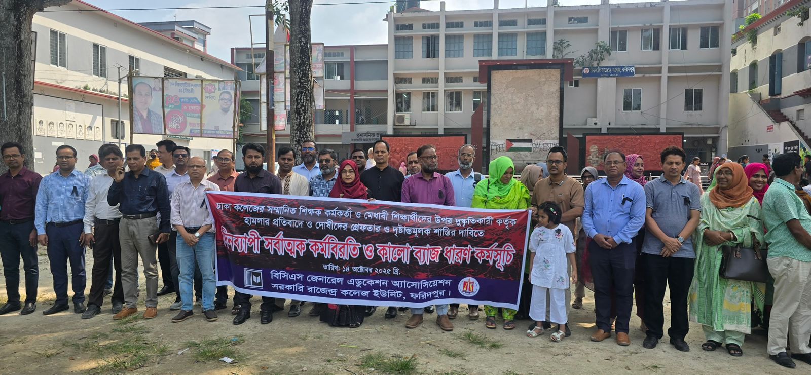 ফরিদপুরের সরকারি রাজেন্দ্র কলেজে সর্বাত্মক কর্মবিরতি ও কালো ব্যাজ ধারণ কর্মসূচি পালন করা হয়েছে। ঢাকা কলেজের সম্মানিত শিক্ষক কর্মকর্তা ও মেধাবী শিক্ষার্থীদের উপরে দুষ্কৃতিকারী কর্তৃক হামলার প্রতিবাদে ও দোষীদের গ্রেফতার ও দৃষ্টান্তমূলক শাস্তির দাবিতে দিনব্যাপী সর্বাত্মক কর্মবিরতি ও কালো ব্যাজ ধারণ কর্মসূচি পালন করা হয়। মঙ্গলবার দুপুর দুইটায় কলেজের প্রশাসনিক ভবনের সামনে রাজেন্দ্র কলেজের ইতিহাস বিভাগের প্রভাষক সাইফুল ইসলামের সভাপতিত্বে এ সময় বক্তব্য রাখেন কলেজের অধ্যক্ষ প্রফেসর এস এম আব্দুল হালিম, উপাধ্যক্ষ প্রফেসর ওবায়দুর রহমান, প্রফেসর ফজলুল করিম এ সময় বক্তারা বলেন, ঢাকা কলেজের শিক্ষকের উপর যে নিপীড়ন অত্যাচার করা হয়েছে তার সুষ্ঠু বিচার আমরা দাবি করছি। পাশাপাশি যারা মেধাবী ছাত্রদের উপরে নিপীড়ন অত্যাচার করেছেন তার বিচার দাবি করেন। বক্তারা বলেন দেশব্যাপী কর্ম বিরতির কার্যক্রমের অংশ হিসেবে আমরা এ কার্যক্রম করছি। অনতিবিলম্বে এই ঘটনার সাথে জড়িতদের গ্রেফতার করা না হলে আগামীতে আরো কঠোর কর্মসূচির ঘোষণা দেন তারা। এ সময় রাজেন্দ্র কলেজ বিভিন্ন বিভাগের শিক্ষক-শিক্ষিকা বৃন্দ উপস্থিত ছিলেন।