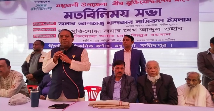 মোঃ সহিদুল ইসলাম, মধুখালী প্রতিনিধি ফরিদপুরের মধুখালীতে বীর মুক্তিযোদ্ধা ও তাদের পরিবারের সদস্যদের সাথে মতবিনিময় করেছেন ফরিদপুর ১ আসনের বিএনপি মনোনীত ধানের শীষ মার্কার সংসদ সদস্য পদপ্রার্থী আলহাজ্ব খন্দকার নাসিরুল ইসলাম। ২৭ জানুয়ারি মঙ্গলবার বিকাল তিন ঘটিকার সময় উপজেলার দিঘলিয়া নিরিবিলি পিকনিক কর্নার মাঠ প্রাঙ্গনে এই সভার আয়োাজন করা হয়। এতে শত শত মুক্তিযোদ্ধা ও তাদের পরিবারের সদস্যরা উপস্থিত ছিলেন। বিএনপির প্রার্থী খন্দকার নাসিরুল ইসলাম মুক্তিযোদ্ধার স্বপক্ষের শক্তি ধানের শীষ মার্কায় বিএনপিকে ভোট দেবার আহবান জানান। মুক্তিযোদ্ধারা তাদের বক্তব্যে,খন্দকার নাসিরুল ইসলামকে ভোট দেওয়ার প্রতিশ্রুতি ব্যক্ত করে। বীর মুক্তিযোদ্ধা খুরশিদ আলমের সভাপতিত্বে, ফরিদপুর জেলা মুক্তিযোদ্ধা কমান্ডার লাল কমিশনার , জেলা সদস্য সচিব বীরমুক্তিযোদ্ধা নজরুল ইসলাম, বাংলাদেশ হিন্দু পরিষদের সিনিয়র সহ-সভাপতি সুভাষ চন্দ্র সাহা, মধুখালী উপজেলা সদস্য সচিব বীর মুক্তিযোদ্ধা আবুল বাশার, বীর মুক্তিযোদ্ধা শ্যামলেন্দু নাথ বসু, বীর মুক্তিযোদ্ধা রওশন -উল- ইসলাম গরিব মোহাম্মাদ , বীর মুক্তিযোদ্ধা শফিকুল হক মিয়া, সাংগঠনিক কমান্ডার বীরমুক্তিযোদ্ধা মো: আলী হোসেন, বীরমুক্তিযোদ্ধা মোঃ শাহজাহান মোল্লা, বীরমুক্তিযোদ্ধা টুকু আবদুস সালাম, বীরমুক্তিযোদ্ধা আখতার হোসেন, বীরমুক্তিযোদ্ধা আলহাজ¦ কাজী মতিউল ইসলাম মুরাদ, বীরমুক্তিযোদ্ধা আলহাজ¦ মোঃ ছালাম মন্ডল, বীরমুক্তিযোদ্ধা মোঃ আবু বক্কার, বীরমুক্তিযোদ্ধা পরমানন্দ বিশ্বা সহ অন্যান্যরা। সে সময় উপস্থিত ছিলেন এবং বক্তব্য রাখেন উপজেলা বিএনপির সভাপতি শাহাবুদ্দিন আহমেদ সতেজ, উপজেলা বিএনপির সাধারণ সম্পাদক আব্দুল আলিম মানিক, উপজেলা বিএনপির সাবেক সভাপতি রাকিব হোসেন চৌধুরী ইরান, মধুখালী উপজেলা ছাত্রদলের সদস্য সচিব সাদ্দাম আরেফিন সহ মধুখালী উপজেলার কয়েকটি ইউনিয়নের চেয়ারম্যান ও অন্যান্য রাজনৈতিক সামাজিক নেতৃবৃন্দ।