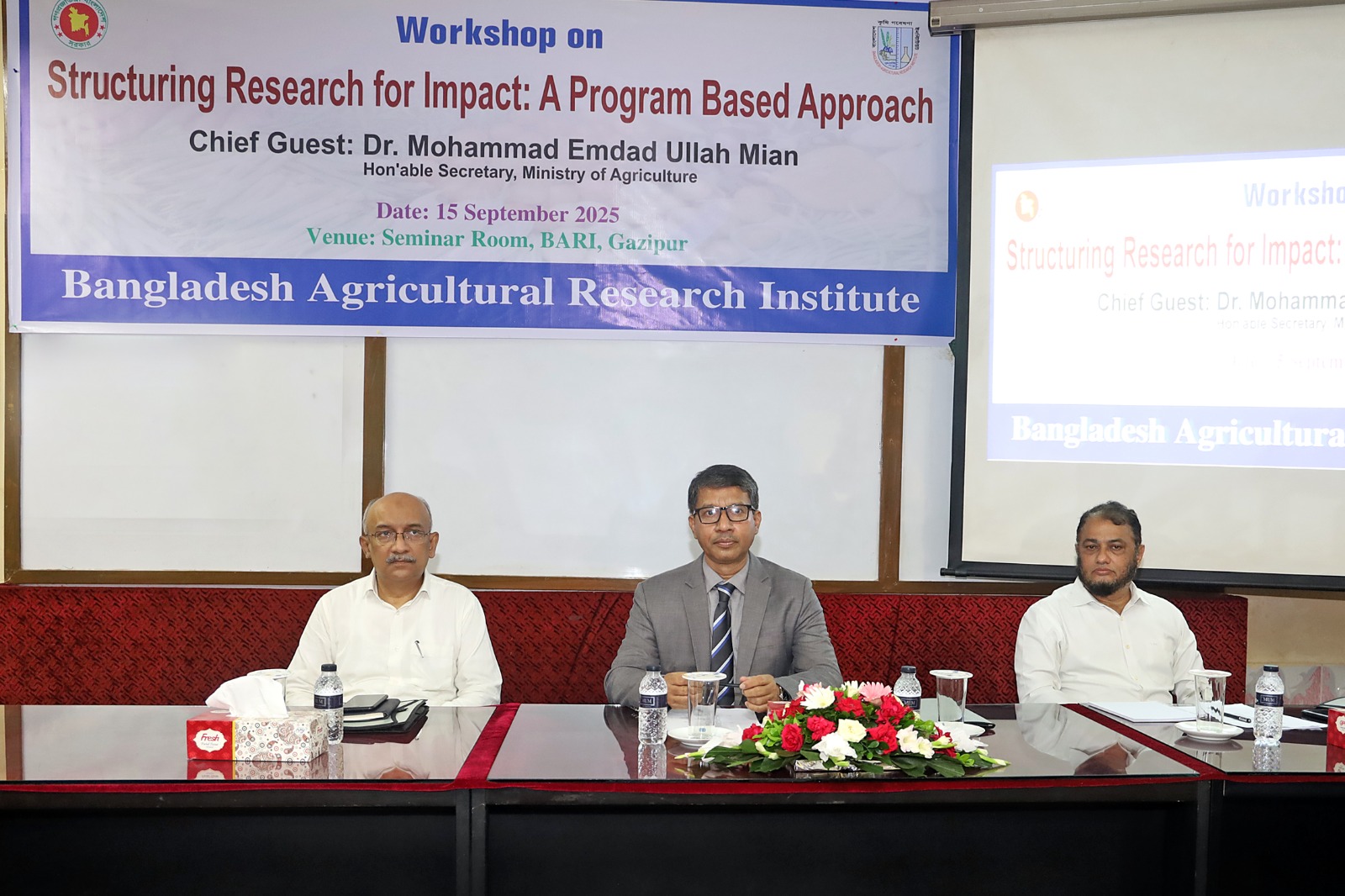 বাংলাদেশ কৃষি গবেষণা ইনস্টিটিউট (বিএআরআই) ১৫ সেপ্টেম্বর ২০২৫ তারিখে ইনস্টিটিউটের সেমিনার কক্ষে “ট্রাকচারিং রিসার্চ ফর ইমপেক্ট: এ প্রোগ্রাম-বেইসট এপরোস.” শীর্ষক একটি কর্মশালার আয়োজন করেছে। উক্ত অনুষ্ঠানে প্রধান অতিথি হিসেবে উপস্থিত ছিলেন গণপ্রজাতন্ত্রী বাংলাদেশ সরকারের কৃষি মন্ত্রণালয়ের সচিব ড. মোহাম্মদ এমদাদ উল্লাহ মিয়ান। তিনি বলেন, বাংলাদেশের কৃষি খাতের চ্যালেঞ্জ মোকাবিলায় গবেষণার গতি বাড়াতে হবে এবং বাস্তবসম্মত ও কার্যকর সমাধানের ওপর জোর দিতে হবে। কৃষি খাতকে ভবিষ্যতের চ্যালেঞ্জ মোকাবিলায় সক্ষম করে তুলতে সরকার গবেষণা ও প্রযুক্তিগত উদ্ভাবনে পূর্ণ সহায়তা দিচ্ছে। বিএআরআই-এর বিজ্ঞানীদের উচিত একটি উন্নত ভবিষ্যতের জন্য সময়োপযোগী এবং চাহিদাভিত্তিক গবেষণা শুরু করা। এছাড়াও দেশের স্থানীয় জাতগুলো যাতে হারিয়ে না যায় সেজন্য দেশীয় জাতের ফসলের স্বাদ ও গুণাগুণ বজায় রেখে জাতসমূহের ফলন বৃদ্ধির লক্ষ্যে গবেষণা করতে হবে। কর্মশালায় মূল প্রবন্ধ উপস্থাপন করেন বিএআরআই-এর মহাপরিচালক ড. মো. আব্দুল্লাহ ইউছুফ আখন্দ। তার উপস্থাপনায় তিনি জলবায়ু পরিবর্তনের সম্ভাব্য প্রভাব, প্রযুক্তিগত উদ্ভাবনের প্রয়োজনীয়তা এবং বিভিন্ন অভিযোজন কৌশল নিয়ে বিস্তারিত আলোচনা করেন। আলোচনায় জলবায়ু-সহনশীল ফসলের জাত উদ্ভাবন, কৃষি প্রযুক্তির কার্যকর স্থানান্তর, গবেষণা ও সম্প্রসারণ সেবার মধ্যে উন্নত সমন্বয় এবং কৃষক ও ভোক্তার মধ্যে সচেতনতা বৃদ্ধির ওপর গুরুত্বারোপ করা হয়। অনুষ্ঠানে বিএআরআই-এর বিভিন্ন বিভাগ/কেন্দ্র/শাখার প্রধানগণ এবং ঊর্ধ্বতন বিজ্ঞানীগণ উপস্থিত ছিলেন।