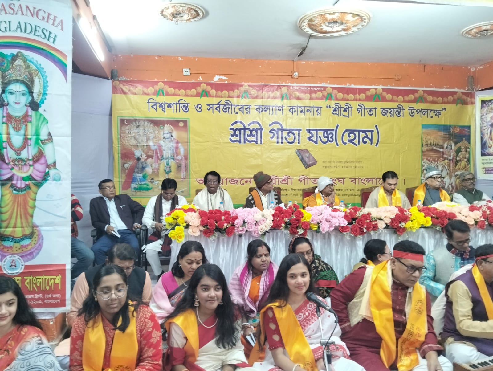 মহাআয়োজনে গতকাল ২৪ পৌষ ১৪৩২ বঙ্গাব্দ(০৯ জানুয়ারী ২০২৬ খ্রীষ্টাব্দ) শুক্রবার, ঢাকাস্থ গোপীবাগ কে. এম. দাস লেনের ভোলানন্দগিরি আশ্রমে শ্রীশ্রী গীতাসংঘ বাংলাদেশ কর্তৃক আয়োজিত বিশ্বশান্তি ও সর্বজীবের কল্যান কামনায় শ্রীশ্রী গীতা জয়ন্তী উপলক্ষ্যে দিনব্যাপি সহস্রকন্ঠে সপ্তশতী শ্রীমদ্ভগব˜্গীতা মন্ত্রে শ্রীশ্রী গীতাযজ্ঞ (হোম)-১৪৩২ উদযাপিত হয়েছে। প্রতি বছরের ন্যায় এবারও স্থানীয় এবং দূর-দূরান্ত থেকে আগত শত শত সনাতন ধর্মাবলম্বী ভক্তবৃন্দের উপস্থিতি ও শুভাগমনে শ্রীশ্রী গীতাযজ্ঞ (হোম) অনুষ্ঠানটি এক মহাযোগের সৃষ্টি করেছে। সনাতনী ধর্মভীরুদের পদচারনায় মুখরিত প্রাঙ্গনটি যেন এক বৃন্দাবন ধামের আবহ তৈরী করেছে। দিনব্যাপি ধর্মীয় ভাবগাম্ভীর্জের মধ্যদিয়ে শ্রীমদ্ভগব˜্গীতা মন্ত্রে উৎসারিত কণ্ঠধ্বনী, যজ্ঞাহুতী দান, স্বাস্রীয় ক্রিয়াচার এবং মুহুূর্মুহু হরিধ¦নী, শঙ্খধ¦নী, নাম সংকীর্তন ও মাতৃমন্ডলীর উলুধ্বনীতে চারিদিক প্রকম্পিত হয়েছিল। সু-প্রভাত হতেই একগুচ্ছ অনুষ্ঠান অর্পনমালায় যথাক্রমে মঙ্গলাচরন, বেদপাঠ, চন্ডীপাঠ, শ্রীকৃষ্ণ পূজা, মঙ্গল প্রদীপ প্রজ্জ্বালনের মাধ্যমে অনুষ্ঠানের শুভারম্ভ করা হয়। বিশিষ্ট ব্যাক্তিবর্গের উপস্থিতি ও ধর্মআলোচনা অনুষ্ঠানের বহুমাত্রিকতা পায়। দেশমাত্রিকা, বিশ্বশান্তি ও সার্বজনীন কল্যান কামনায় বিশিষ্টজনেদের উপস্থিতিতে এক প্রার্থনার আয়োজন করা হয়। সনাতন ধর্মাবলম্বী হিন্দু সম্প্রদায়ের প্রাপ্তি ও প্রত্যাশার আকুলতা ভগবান শ্রীচরনকমলে ভক্তিভরে প্রার্থনা নিবেদন করা হয়।