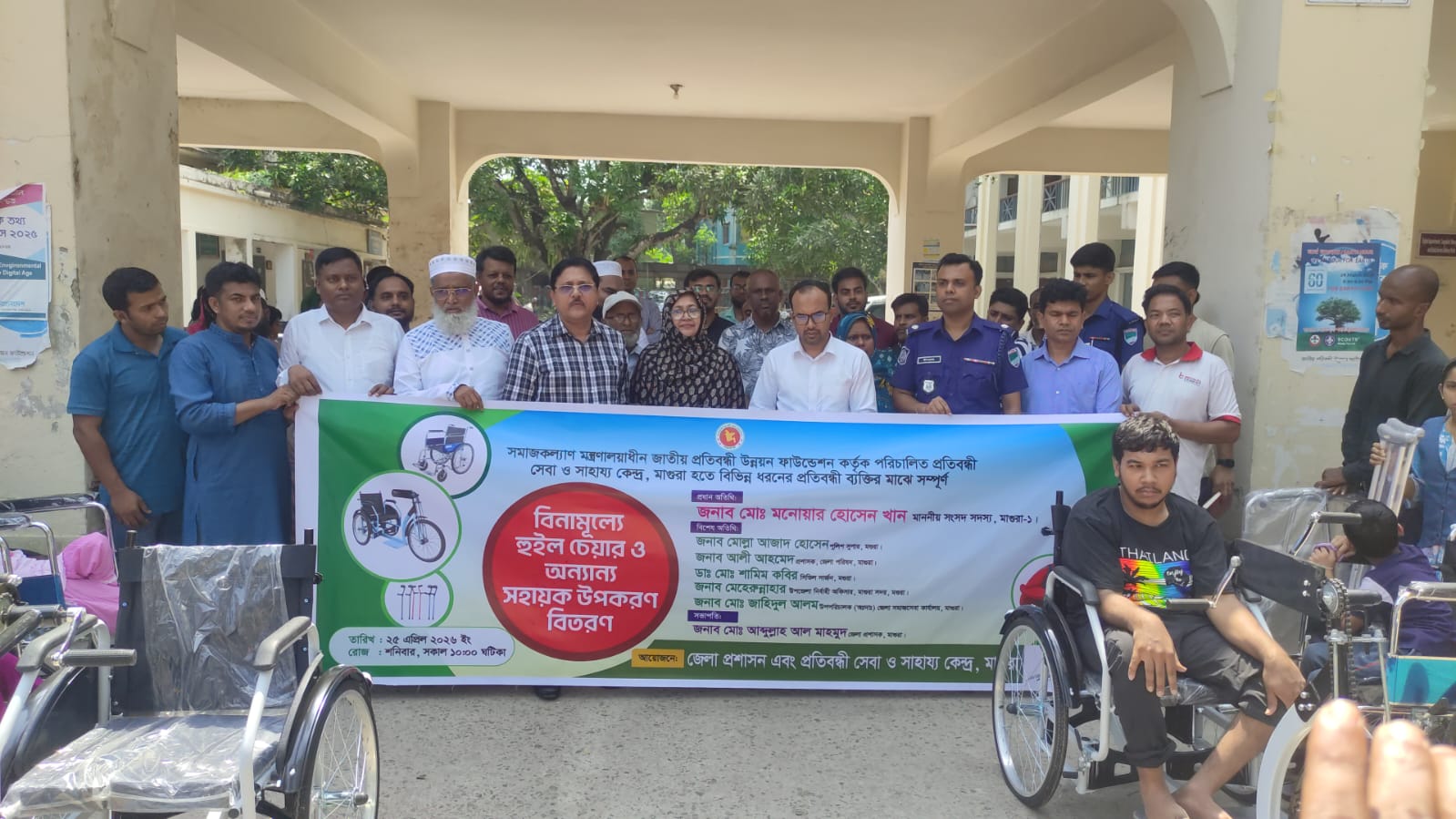 মাগুরায় প্রতিবন্ধী ব্যক্তিদের মাঝে বিনামূল্যে হুইলচেয়ারসহ বিভিন্ন সহায়ক উপকরণ বিতরণ করা হয়েছে। সমাজকল্যাণ মন্ত্রণালয়াধীন জাতীয় প্রতিবন্ধী উন্নয়ন ফাউন্ডেশন পরিচালিত প্রতিবন্ধী সেবা ও সাহায্য কেন্দ্রের উদ্যোগে এ কর্মসূচি বাস্তবায়ন করা হয়। শনিবার (২৫ এপ্রিল) সকাল ১০টায় জেলা প্রশাসকের কার্যালয় চত্বরে আয়োজিত অনুষ্ঠানে এসব উপকরণ বিতরণ করা হয়। অনুষ্ঠানে মোট ৩৫টি হুইলচেয়ার, ৩টি ট্রাইসাইকেল, ২টি ওয়াকার, ১টি এলবো ক্রাচ, ১টি অক্সিলারি ক্রাচ এবং ১টি হিয়ারিং এইড বিতরণ করা হয়।