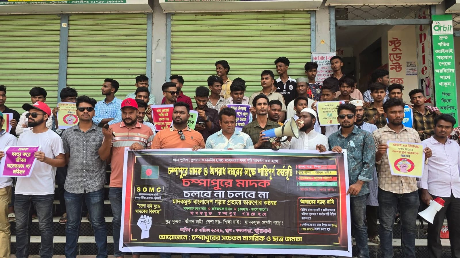 পটুয়াখালীর কলাপাড়া উপজেলায় মাদক ও বিভিন্ন অপরাধ দমনের দাবিতে মানববন্ধন ও সমাবেশ অনুষ্ঠিত হয়েছে। রবিবার (০৫ এপ্রিল) বেলা ১১টায় কলাপাড়া প্রেসক্লাব চত্বরে এ কর্মসূচির আয়োজন করে চম্পাপুর ইউনিয়নের সচেতন নাগরিক ও ছাত্রদল।সমাবেশে বক্তব্য রাখেন চম্পাপুর ইউনিয়ন স্বেচ্ছাসেবক দলের সদস্য সচিব মোঃ সৌরভ আহমেদ শুভ, উপজেলা ছাত্রদলের আহ্বায়ক কাজী ইয়াদুল ইসলাম তুষার, সদস্য সচিব আমীরুল ইসলাম ফাহিম, চম্পাপুর ইউনিয়ন ছাত্রদল সভাপতি ইমতিয়াজুর রহমান কোয়েল মোল্লা এবং ধানখালী ডিগ্রি কলেজ ছাত্রদলের সভাপতি মোঃ রাব্বি মোল্লা প্রমুখ। বক্তারা বলেন, মাদক সমাজকে ধ্বংসের দিকে ঠেলে দিচ্ছে এবং এর সঙ্গে জড়িতদের কারণে আইন-শৃঙ্খলা পরিস্থিতির অবনতি ঘটছে। তারা মাদক ব্যবসায়ী ও সেবনকারীদের দ্রুত শনাক্ত করে আইনের আওতায় আনার দাবি জানান।এসময় বক্তারা থানা পুলিশ ও উপজেলা প্রশাসনের প্রতি জোর দাবি জানিয়ে বলেন, মাদক ও অপরাধ দমনে দ্রুত ও কঠোর পদক্ষেপ নিতে হবে। অন্যথায় ভবিষ্যতে আরও কঠোর কর্মসূচি ঘোষণা করা হবে বলেও হুঁশিয়ারি দেন তারা।মানববন্ধনে স্থানীয় বিভিন্ন শ্রেণি-পেশার মানুষ অংশগ্রহণ করেন, যা পুরো এলাকায় সচেতনতা সৃষ্টিতে গুরুত্বপূর্ণ ভূমিকা রাখবে বলে আয়োজকরা আশা প্রকাশ করেন।