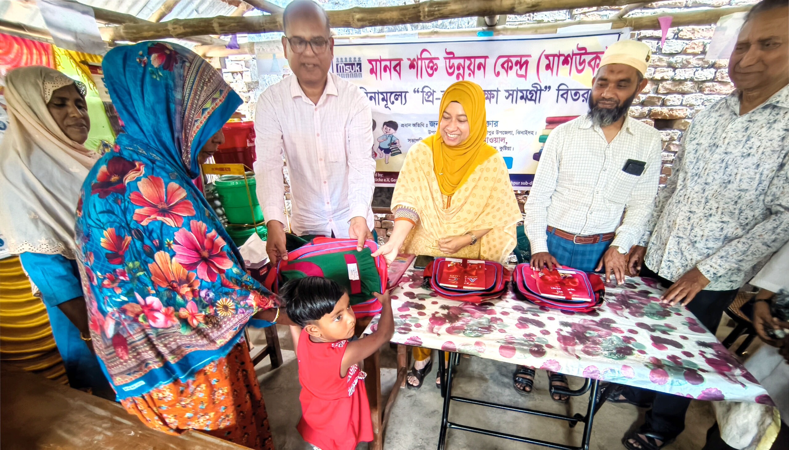 সাজ্জাদ আহমেদ, ঝিনাইদহ : মাশউক এর উদ্দ্যোগে ঝিনাইদহের মহেশপুর প্রকল্পের প্রি-স্কুলের ছাত্র-ছাত্রীদের মাঝে বিনামূল্যে স্কুল সামগ্রী বিতরণ করা হয়েছে। সোমবার বেলা ১১টার সময় মাশউক এর মহেশপুর উপজেলায় পরিচালিত “সাসটেইনেবল প্রিভেনশন অফ আর্সেনিক পয়জনিং ইন মহেশপুর সাব ডিসট্রিক্ট, ঝিনাইদহ ডিসট্রিক্ট” প্রকল্পের মহেশপুর উপজেলা’র, নাটিমা ইউনিয়নের দারিয়াপুর গ্রামে মানব শক্তি উন্নয়ন কেন্দ্র (মাশউক) এর প্রি-স্কুলের ছাত্র/ছাত্রীদের মাঝে বিনামুল্যে স্কুল সামগ্রী (বই, ব্যাগ, স্লেট ও পোষাক) বিতরণ করা হয়।