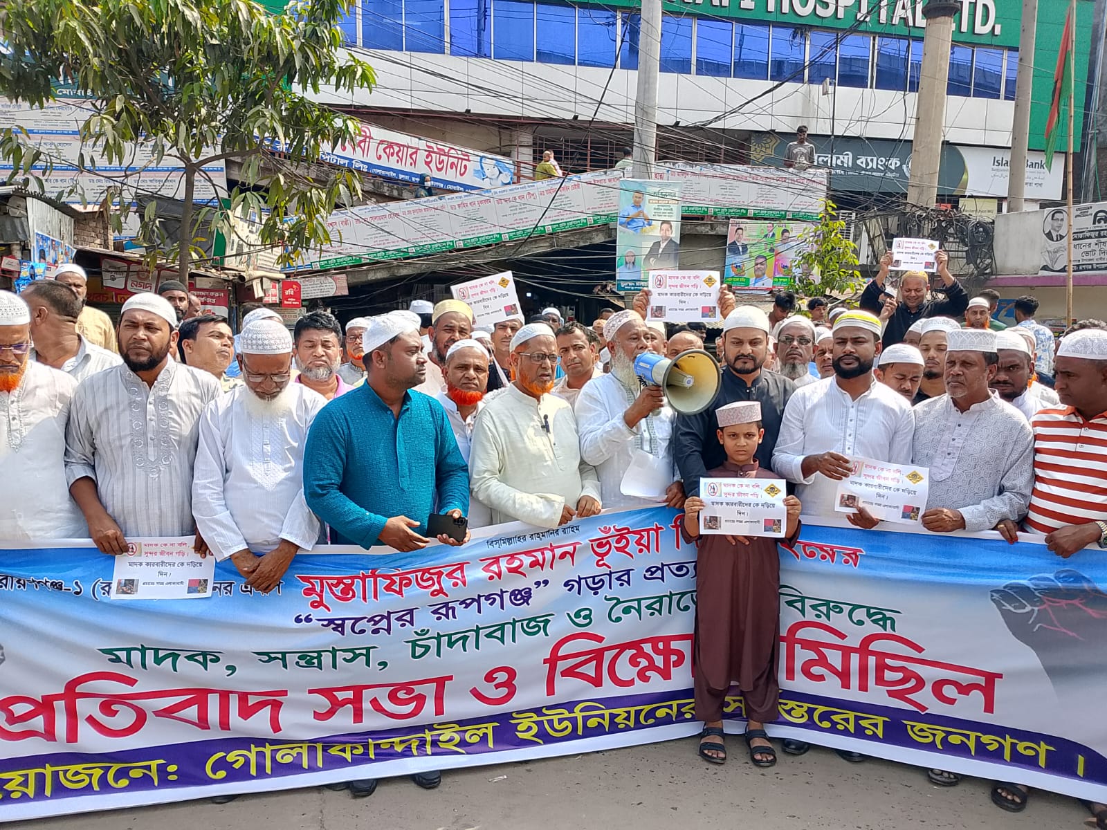 নারায়ণগঞ্জের রূপগঞ্জে মাদক সন্ত্রাস ও চাঁদাবাজদের বিরুদ্ধে প্রতিবাদ সভা ও বিক্ষোভ মিছিল করেছেন গোলাকান্দাইল ইউনিয়নের সর্বস্তরের জনগণ। ২৭ মার্চ শুক্রবার দুপুরে উপজেলার গোলাকান্দাইল বাস স্ট্যান্ড এলাকায় প্রতিবাদ সভা অনুষ্ঠিত হয়। সভায় সভাপতিত্ব করেন গোলাকান্দাইল ইউনিয়ন বিএনপির সাধারণ সম্পাদক ও গোলাকান্দাইল ইউনিয়ন পরিষদের সাবেক চেয়ারম্যান হাজী আব্দুল মতিন। এ সময় বক্তব্য রাখেন গোলাকান্দাইল ইউনিয়ন বিএনপির সভাপতি আব্দুল আজিজ মাস্টার, সিনিয়র সহসভাপতি রজব আলী ফকির, সহসভাপতি শাহিন মিয়া, সাংগঠনিক সম্পাদক মোস্তফা মিয়া, চন্দন ফকির, যুগ্ম সম্পাদক রেজাউল করিম, গোলাকান্দাইল ইউনিয়ন যুবদলের সভাপতি ইয়াছিন মিয়া, সাধারণ সম্পাদক ওমর হোসেন, ছাত্রদল নেতা রাকিব হাসান, অন্তর দাস, ইউনিয়ন সেচ্ছাসেবক দল নেতা ইলিয়াস মিয়া, বিনয় চন্দ্র ঘোষ, বিএনপি নেতা অলি ইসলাম প্রমুখ।