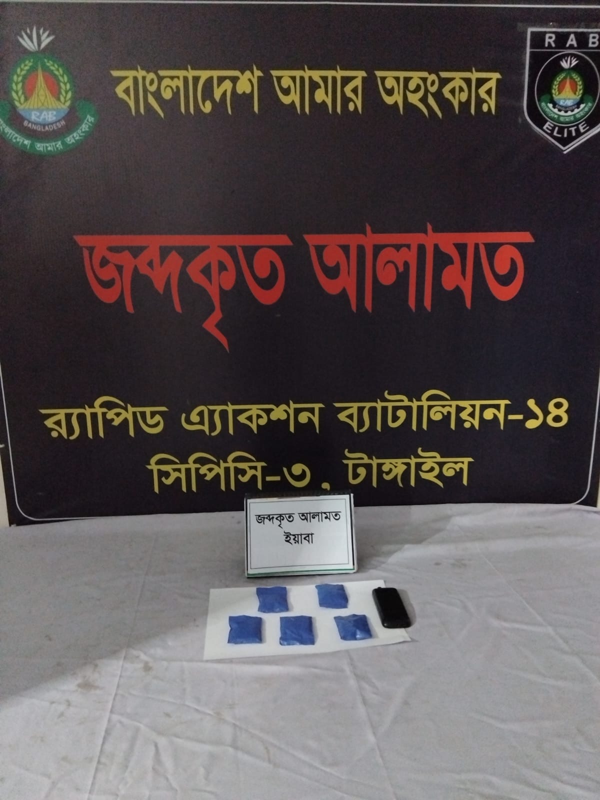 সিপিসি-৩, র্যাব-১৪, টাঙ্গাইল ক্যাম্পের আভিযানিক দল গোপন সংবাদের ভিত্তিতে ২১ এপ্রিল ২০২৬ খ্রি. অনুমান বিকাল ০৪:০৫ ঘটিকায় টাঙ্গাইল জেলার সদর থানার ঢাকা-টাঙ্গাইল মহাসড়কে আশেকপুর বাইপাস মোড়ে পাকা রাস্তার উপর চেকপোস্ট স্থাপন করে। উক্ত চেকপোস্টে ঢাকা থেকে ছেড়ে আসা চাঁপাইনবাবগঞ্জ গামী “ন্যাশনাল ট্রাভেলস” নামক যাত্রীবাহী বাস তল্লাশী করে মাদক কারবারি মোঃ নাজিম উদ্দিন স্বপন (৩৫), জেলা-চাঁপাইনবাবগঞ্জকে আটক করে। উপস্থিত সাক্ষীদের উপস্থিতিতে জিজ্ঞাসাবাদে তার হেফাজতে অবৈধ মাদকদ্রব্য “ইয়াবা ট্যাবলেট” থাকার কথা স্বীকার করে। আটককৃত মাদক কারবারির দেওয়া তথ্য ও দেখানো মতে তার হেফাজতে থাকা ব্যাগের ভিতর বিশেষ কৌশলে ৯৬৫ (নয়শত পঁয়ষট্টি) পিচ নেশাজাতীয় অবৈধ মাদকদ্রব্য “ইয়াবা ট্যাবলেট” উদ্ধার করতঃ ০১ টি মোবাইল ফোন জব্দ করতে সক্ষম হয়। ধৃত মাদক কারবারির বিরুদ্ধে পরবর্তী আইনগত ব্যবস্থা গ্রহণের জন্য টাঙ্গাইল জেলার সদর থানায় আলামতসহ মাদক কারবারিকে হস্তান্তর করা হয়েছে।