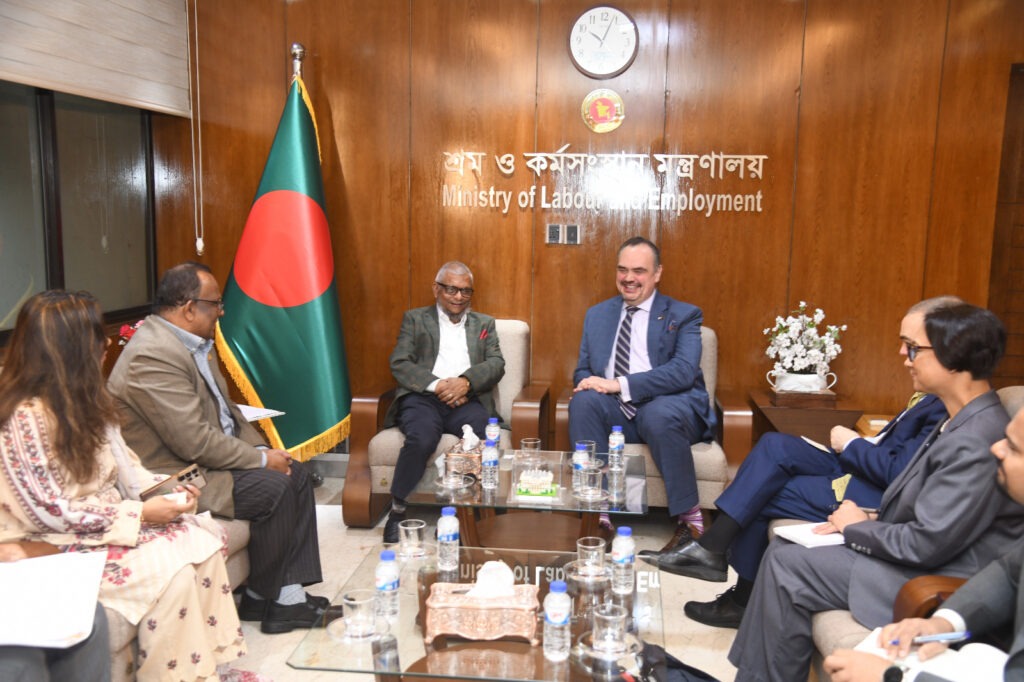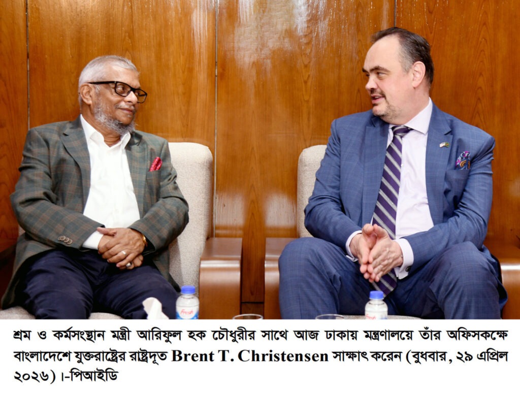 শ্রম ও কর্মসংস্থান মন্ত্রী আরিফুল হক চৌধুরীর সাথে যুক্তরাষ্ট্রের রাষ্ট্রদূত ব্রেন্ট টি. ক্রিস্টেনসেন আজ সকালে সচিবালয়ে সৌজন্য সাক্ষাৎ করেছেন। সাক্ষাৎকালে দুই দেশের স্বার্থসংশ্লিষ্ট বিভিন্ন বিষয় নিয়ে আলোচনা হয়। বাংলাদেশের শ্রম খাতের উন্নয়নে অব্যাহত সহযোগিতার জন্য মার্কিন যুক্তরাষ্ট্রের প্রতি কৃতজ্ঞতা ও ধন্যবাদ জানান মন্ত্রী। বহির্বিশ্বে বাংলাদেশের ভাবমূর্তি আরও উজ্জ্বল করার ক্ষেত্রে যুক্তরাষ্ট্রের সহযোগিতা ভবিষ্যতেও বজায় থাকবে বলে তিনি আশাবাদ ব্যক্ত করেন ।মন্ত্রী বলেন, শ্রম খাতের উন্নয়ন এবং শ্রমিকের অধিকার নিশ্চিতকরণে যুক্তরাষ্ট্রের সাথে একসঙ্গে কাজ করার অনেক সুযোগ রয়েছে। যুক্তরাষ্ট্রের শ্রম সম্পর্কিত ১১ দফার সাথে সামঞ্জস্য রেখে বাংলাদেশের শ্রম আইন (সংশোধন), ২০২৬ জাতীয় সংসদে পাস হয়েছে বলে মন্ত্রী জানান।