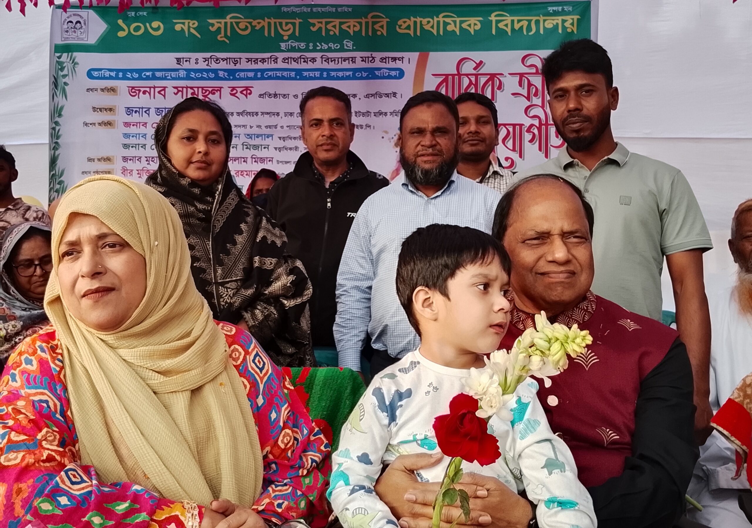 ঢাকার ধামরাাইয়ে সুতিপাড়া ইউনিয়ন ১০৩ নং সুতিপাড়া সরকারি প্রাথমিক বিদ্যালয়ের বার্ষিক ক্রীড়া প্রতিযোগিতা পুরস্কার বিতরণী অনুষ্ঠান উপলক্ষে বিদ্যালয় প্রাঙ্গণ ছিল উৎসবমুখর। সোমবার (২৬ ) জানুয়ারি সকালে দশটার সময় সুতিপাড়া সরকারি প্রাথমিক বিদ্যালয়ের খেলার মাঠে অনুষ্ঠিত হয় ।শিক্ষার্থী, অভিভাবক ও এলাকাবাসীর উপস্থিতিতে মুখরিত হয়ে ওঠে পুরো পরিবেশ। অনুষ্ঠানে প্রধান অতিথি হিসেবে উপস্থিত ছিলেন জনাব সামছুল হক প্রতিষ্ঠাতা ও নির্বাহী পরিচালক এসডিআই সামছুল হক বক্তব্যে বলেন স্কুলের জন্য একটি ল্যাপটপ প্রিন্টার উপহার দিবেন। উদ্বোধক হিসেবে উপস্থিত ছিলেন জনাব মোঃ জালাল উদ্দিন সাবেক অর্থ বিষয়ক সম্পাদক ঢাকা জেলা বিএনপি । প্রধান পৃষ্ঠপোষক বীর মুক্তিযোদ্ধা ( কবি) আব্দুর রহমান । সভাপতিত্ব করেন সহ , উপজেলা ? প্রাথমিক শিক্ষা অফিসার ধামরাই ঢাকা । উপস্থিত ছিলেন অভিজিৎ দেবনাথ জোনাল অফিসার এসডিআই। বিশেষ অতিথি উপস্থিত ছিলেন সিনিয়র ডিরেক্টর জনাব কামরুল হাসান এসডিআই । উপস্থিত ছিলেন শামসুর রহমান সাধারণ সম্পাদক ৮ নং ওয়ার্ড বিএনপি ও সহ-সভাপতি শ্রীরামপুর সূতিপাড়া উদীয়মান যুবক সমিতির । উপস্থিত ছিলেন জনাব মোহাম্মদ মোবাখখারুল ইসলাম মিজান উপজেলা শিক্ষা অফিসার । উপস্থিত ছিলেন জনাব এমদাদুল হক প্যানেল চেয়ারম্যান ৮ নং ওয়ার্ড সুতিপাড়া।অনুষ্ঠানে সার্বিক সহযোগিতায় করেন জনাব মোঃ ইসমাইল হোসেন সভাপতি শ্রীরামপুর সুতিপাড়া উদীয়মান যুবক সমিতি । উপস্থিত ছিলেন জনাব সাইদুর রহমান সহকারী শাখা ব্যবস্থাপক এসডিআই । বিএনপি যুবদলের নেতা মোঃ রুবেল হোসেন। মাঠের সার্বিক দায়িত্ব ছিলেন মোহাম্মদ ইমরান হোসেন । ধন্যবাদান্তে জনাব রেবেকা সুলতানা । প্রধান শিক্ষক সুতিপাড়া সরকারি প্রাথমিক বিদ্যালয়।আলোচনা সভা শেষে মনোজ্ঞ সাংস্কৃতিক অনুষ্ঠান পরিবেশিত হয়, যা উপস্থিত সবার মাঝে আনন্দ ছড়িয়ে দেয়। সফলভাবে অনুষ্ঠান সম্পন্ন হওয়ায় শিক্ষক, শিক্ষার্থী ও অভিভাবকদের মধ্যে সন্তোষ প্রকাশ করেন।